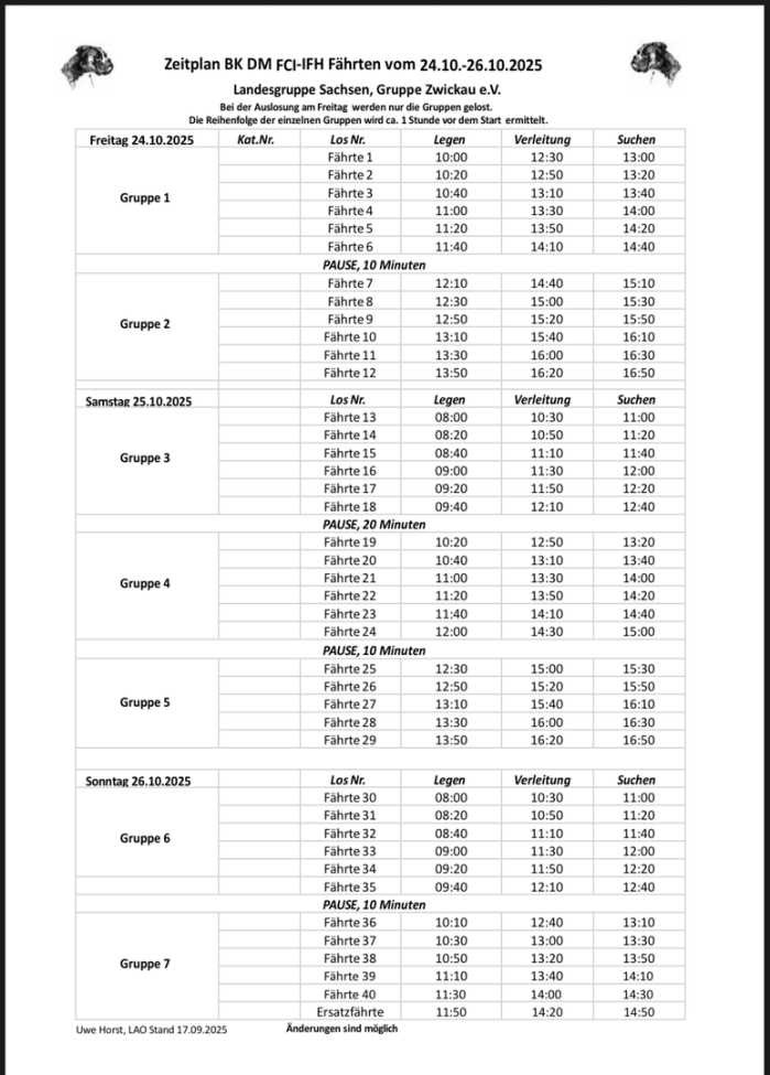 Die HF halten sich mit ihren Hunden bitte ab 15.30 Uhr am Gelände des BK Zwickau e.V. bereit für die Siegerehrung.